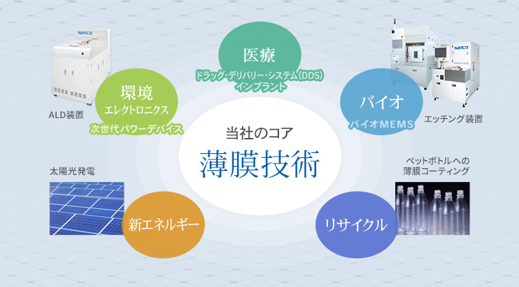 当社は、半導体等電子部品製造装置の製造及び販売を行っております。当社の属する半導体製造装置業界には、シリコンを材料とした半導体製造装置を販売する企業は多く存在しますが、当社は全半導体製造装置市場の数パーセント程度の市場ですが成長が期待できる窒化ガリウム(GaN)、ガリウムヒ素(GaAs)や炭化シリコン(SiC)などの化合物を主体材料とした化合物半導体製造装置に特化しております。 当社は、1979年9月の設立以来、「薄膜」を中核技術とした、材料開発と最先端のプロセステクノロジーの開発に注力してまいりました。化合物半導体には、シリコンにはない優れた特性が有り、その「薄膜」用途は環境分野や医療分野など将来的にも無限の可能性を秘めております。