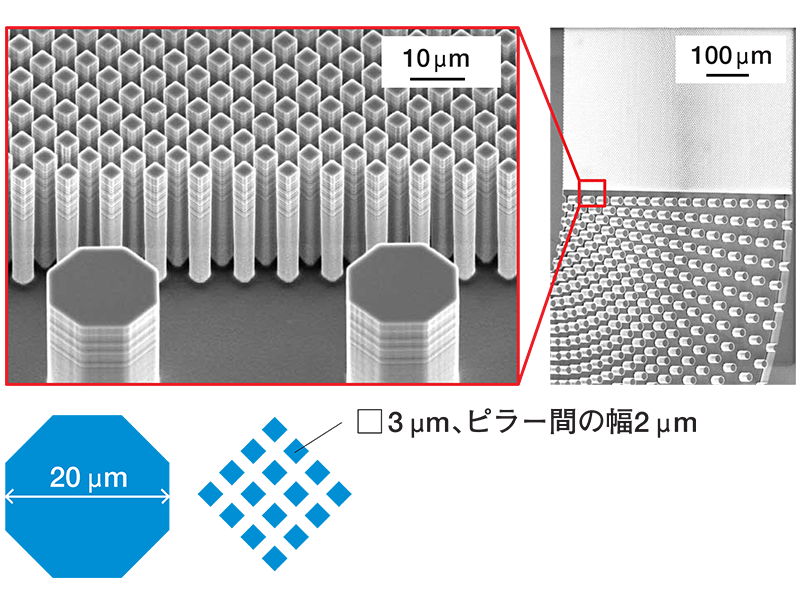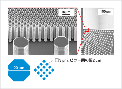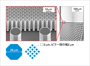 深さ30μmの異なるサイズのピラ―の形成が実現している。
