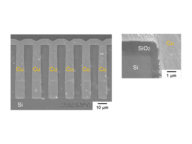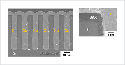 SIPスパッタによるシードCu膜厚:310nmの導入とめっき条件の最適化により低温プラズマCVD膜を1.36μm形成後でも高アスベクト比ビア(~7)への銅の完全充填が可能 。