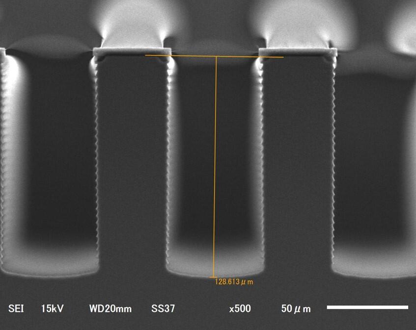 ボッシュプロセスによる極微細なSiの深掘り加工例。…