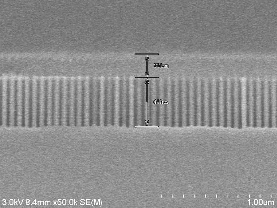 ボッシュプロセスによる極微細なSiの深掘り。ø30 nmのピラーパターンにおいて、レジストマスクとの選択比を十分に取り、形状を制御しつつ、深さ444 nmの深掘りを実現しています。Siの深掘り加工で問題となるスカロップは、8.6 nm以下に抑制しています。エッチングレートは370 nm/min。本加工は位相変調機能を有する空間光制御デバイスに応用できます。