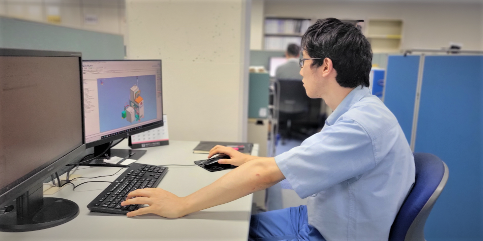 私は設計部で機械設計を担当しています。機械設計というのは、装置のハード面の設計から、装置に必要な部品の選定、さらに装置出荷後の改造やメンテナンス部品の選定等も行っています。設計部に異動した当初は設計実績のあるリピート装置や小型装置の設計を担当していましたが、少しずつ大きな装置を任されるようになり、成長を実感しています。特に、「特注装置」の設計をやり遂げた時の達成感は忘れられません。この時の「特注装置」とは、お客様から「小型の装置にハイスペックな部材を取り付けてほしい」との依頼を受けて取り組んだものでした。装置のコアとなる部分の設計もあり、気体の排気量や静電容量の計算も必要で、私にとってはかなりチャレンジングなものでした。技術に詳しい開発部とも連携し、先輩にも相談しながら徐々にかたちにしていきました。この仕事を通じて“設計の肝”を学べたと感じています。