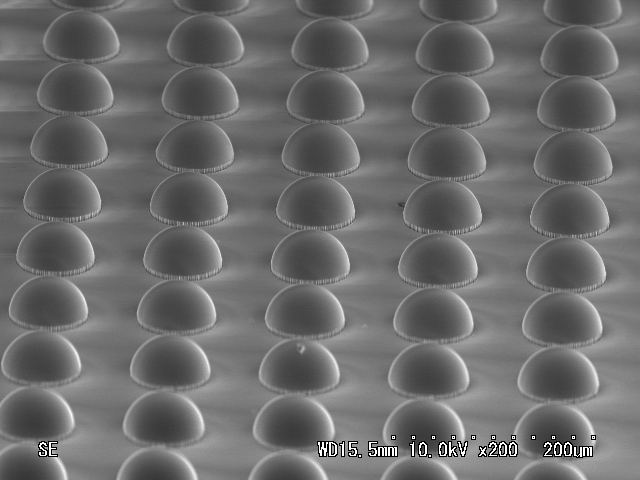 A lens layer of P- and B-doped SiO₂ was formed on the SiO₂ substrate by LSCVD® equipment to achieve a predetermined reflow temperature, which was dry-etched in a cylindrical form by ICP etching equipment, and then reflow (in the range of 900-1150°C) was performed to form the lens. The curvature of the lens can be controlled by etching conditions, film thickness, reflow temperature, etc.