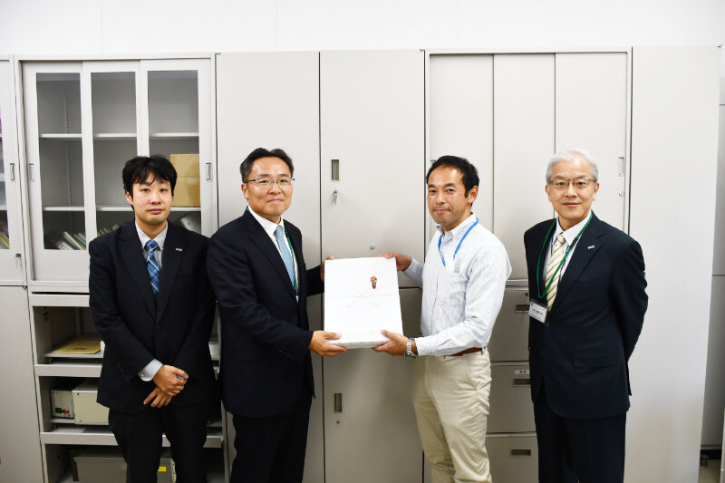 向かって右より2人目が理化学研究所 山本チームリーダー、3人目が当社社長 川邊 史。