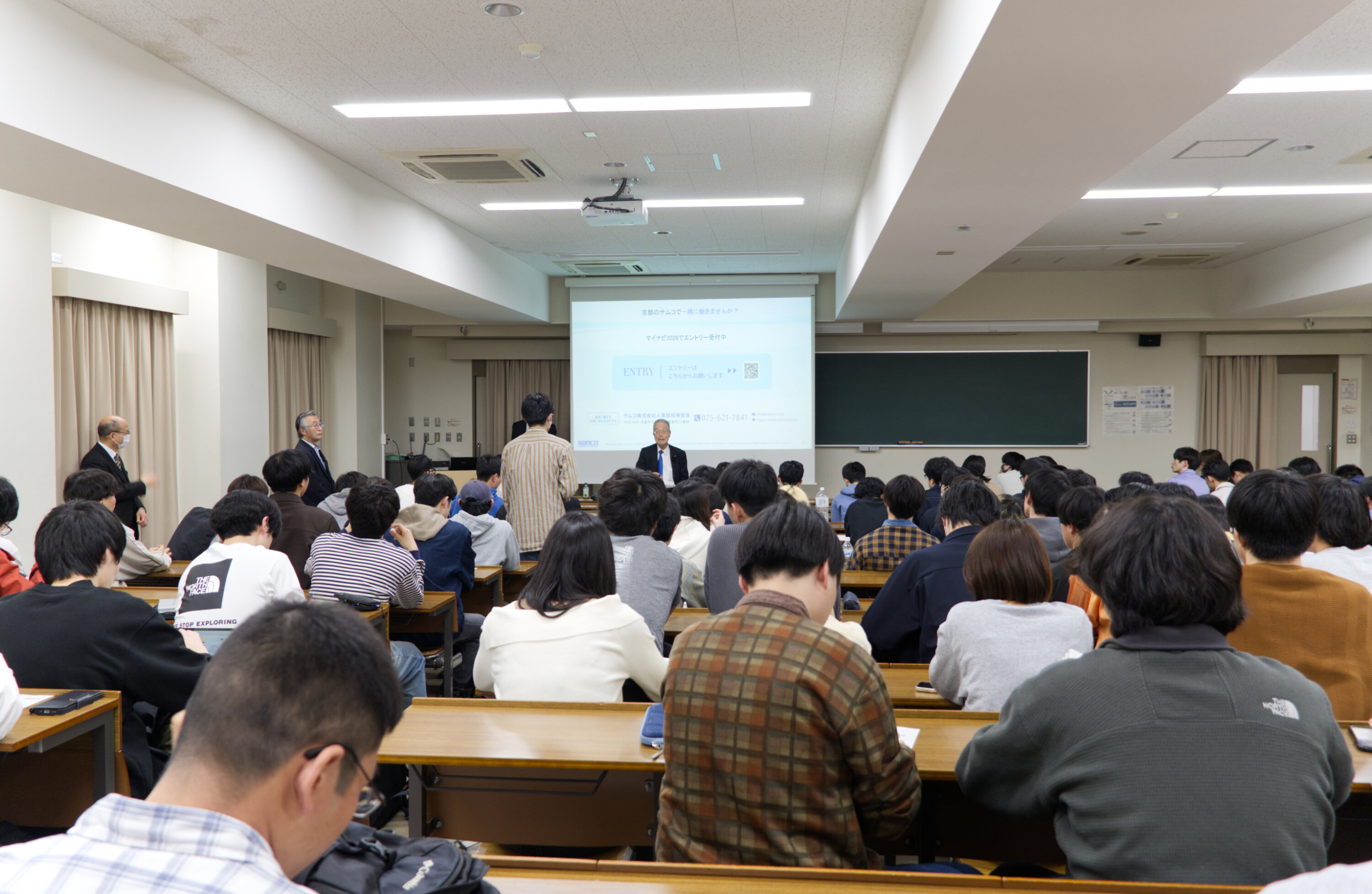 4月17日(木)、当社代表取締役会長の辻理が登壇し、学部生及び大学院生をはじめとする約130名に向けて、本講座開講の趣旨と材料学全般についての講義を行いました。辻は、自身の経歴や、ガレージからスタートしたサムコの創業から成長までの道のりについて語りました。また、京都および日本における成功する起業家の要素や、サムコで取り組んでいるワイドバンドギャップ材料や化合物半導体を含む先端材料の研究開発についても紹介しました。